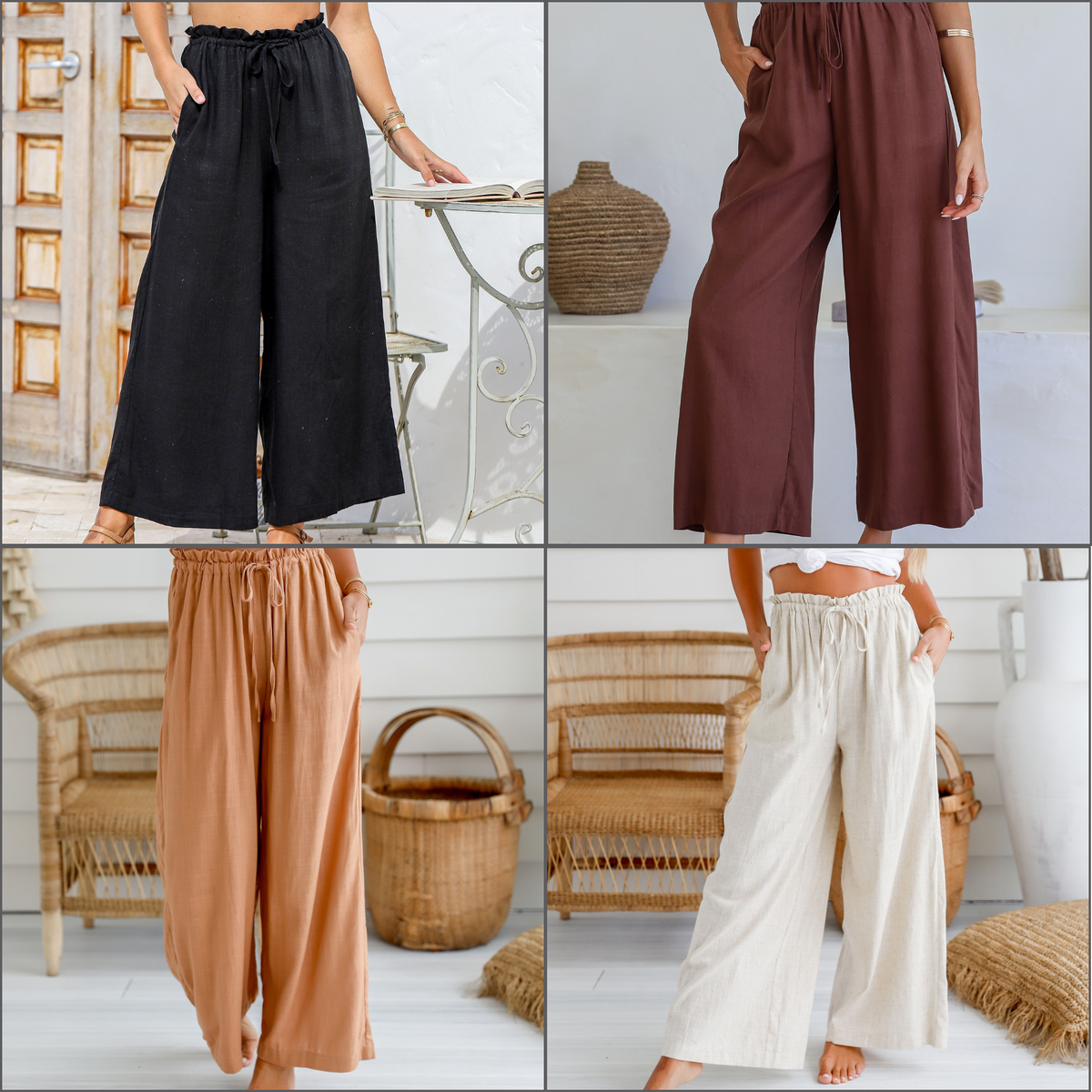 ....our famous linen blend pants come out! Just the ticket for your casual summer wardrobe. So easy to pair with a simple T-shirt or tank, or take it a step further and dress them up with a silky cami, lace top or kimono. Click here to view our range of pants. Please note if stock is low we're trying hard behind the scenes to get you more. Reach out via Contact Us for updates x
