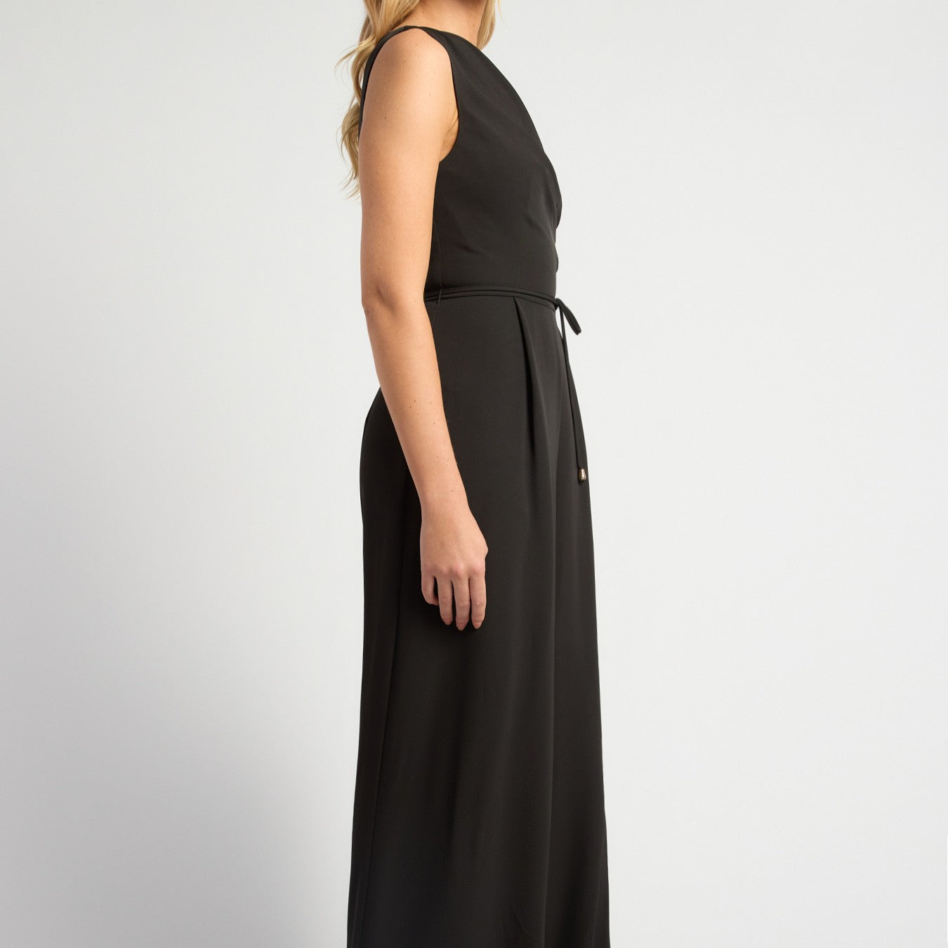 With a boat neck design and side ruching on the torso, you get an elegant cut to the bodice of this gorgeous jumpsuit. Add a back zip, tie waist and long wide leg in a slightly stretchy satin feel fabric in classic black and you have a very versatile piece that can go from the office to a cocktail party. Sizing is a little on the fitted side, so go up a size if you prefer.