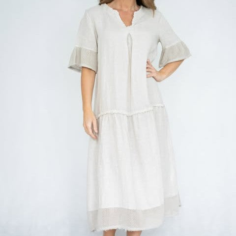 Italian made and inspired, this gorgeous linen dress has the details that make it bellissimo! Mesh trim, frayed edges for that organic look, tiered skirt, calf length, V neck with pleat and just perfect for the hotter days. True to size for a relaxed fit.