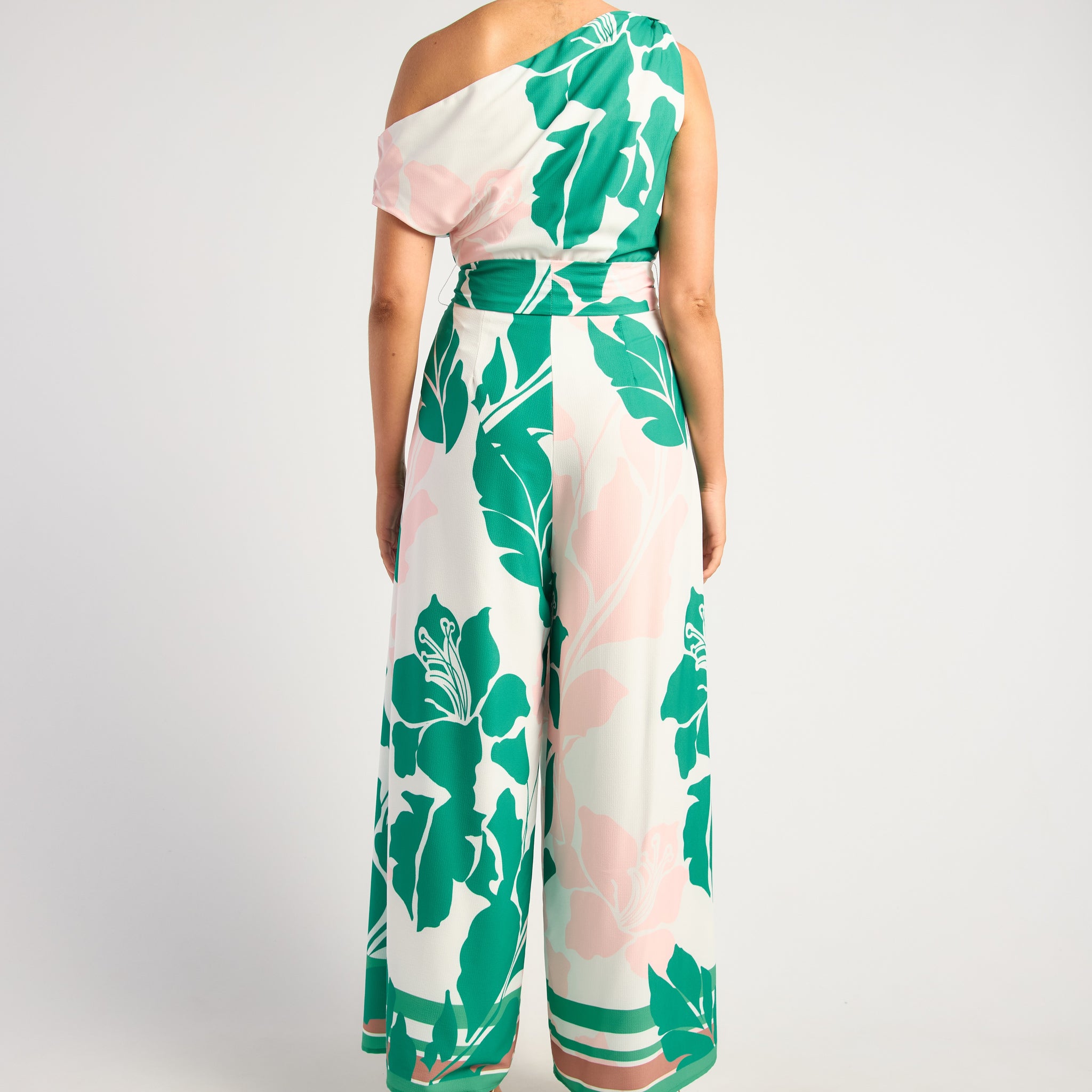 So fresh and fabulous! In the popular drop shoulder style with size zip, waist tie, elastic on the back of the waist, side pockets and a gorgeous floaty wide leg. In a delightful print of bold green and pink floral on a base of white. So very summer. Go up a size as it's a little snug.