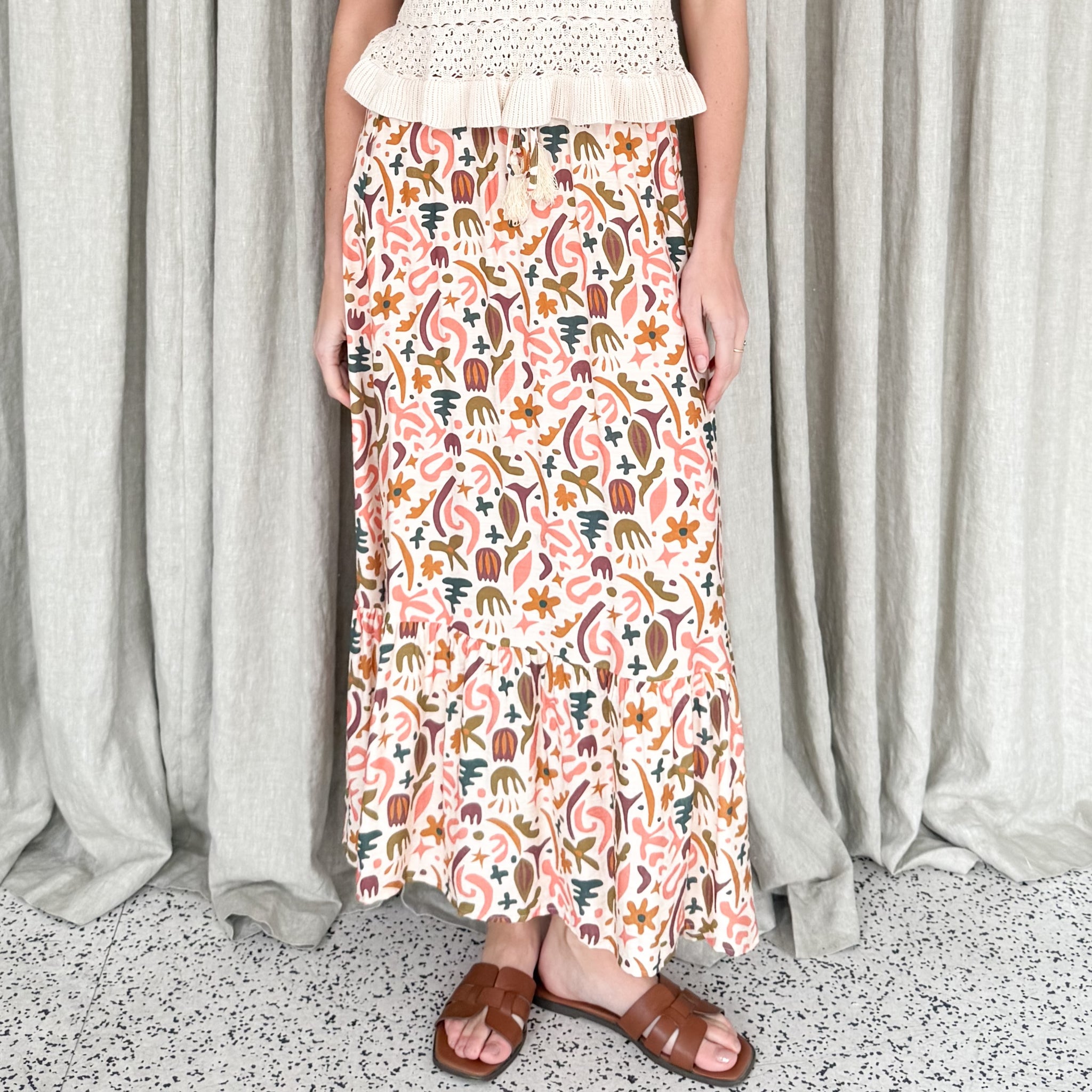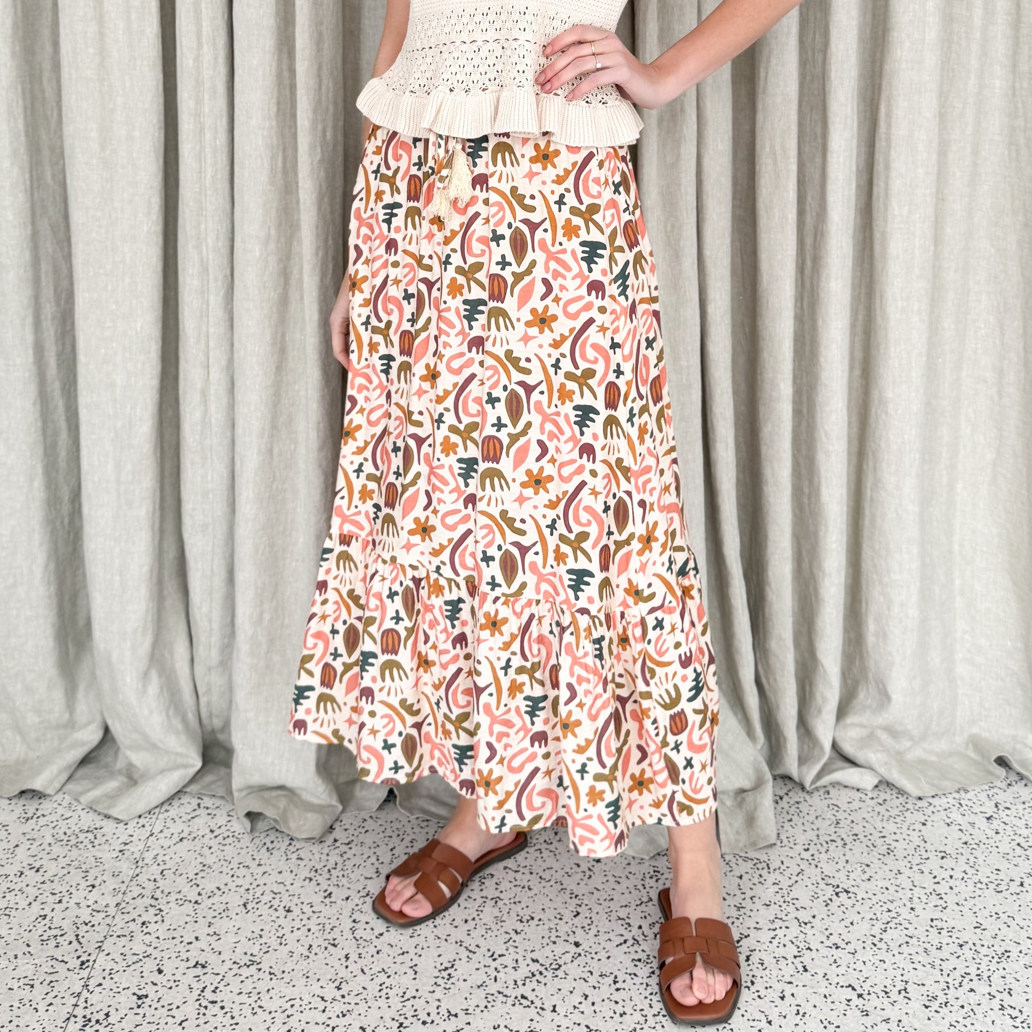 Hello sweet little print. Classic maxi skirt in this South of the Border inspired print. So feminine and easy to wear with a tank or little festival top. You know the look we're going for. Elastic waist with tassel tie, and a single tier at the bottom for a bit of frillyness. Up to size 18.  A little tan shoe team with our Nettie Knit Tank Top and you have an easy little outfit.