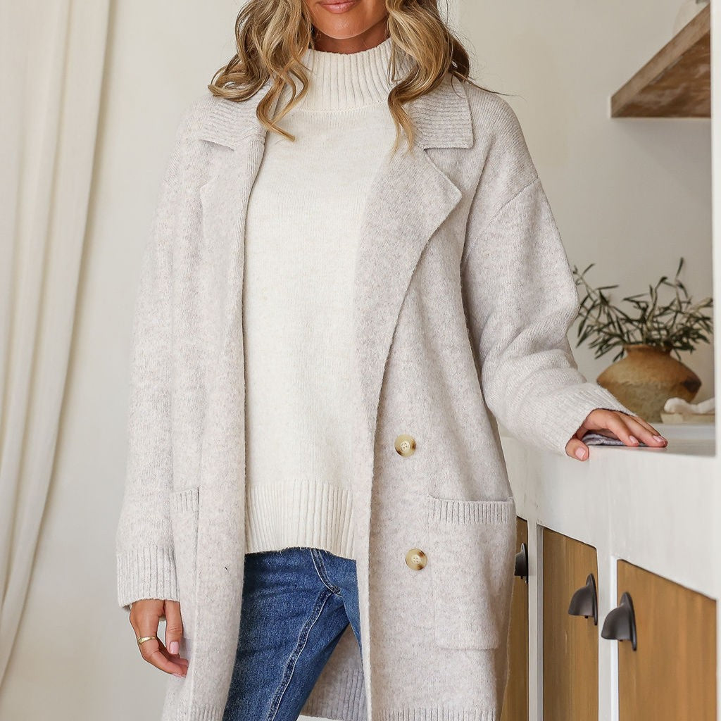 It's in the detail. Ribbing on collar, pockets and hem add to the style of this thick, cozy wool blend coatigan in our favourite shade of light latte. This style is more like a jacket in it's design, sitting a little shorter and with the "double breasted" look with the 4 buttons. Please note these buttons are purely for effect and are not functioning. Plenty of room in the fit.